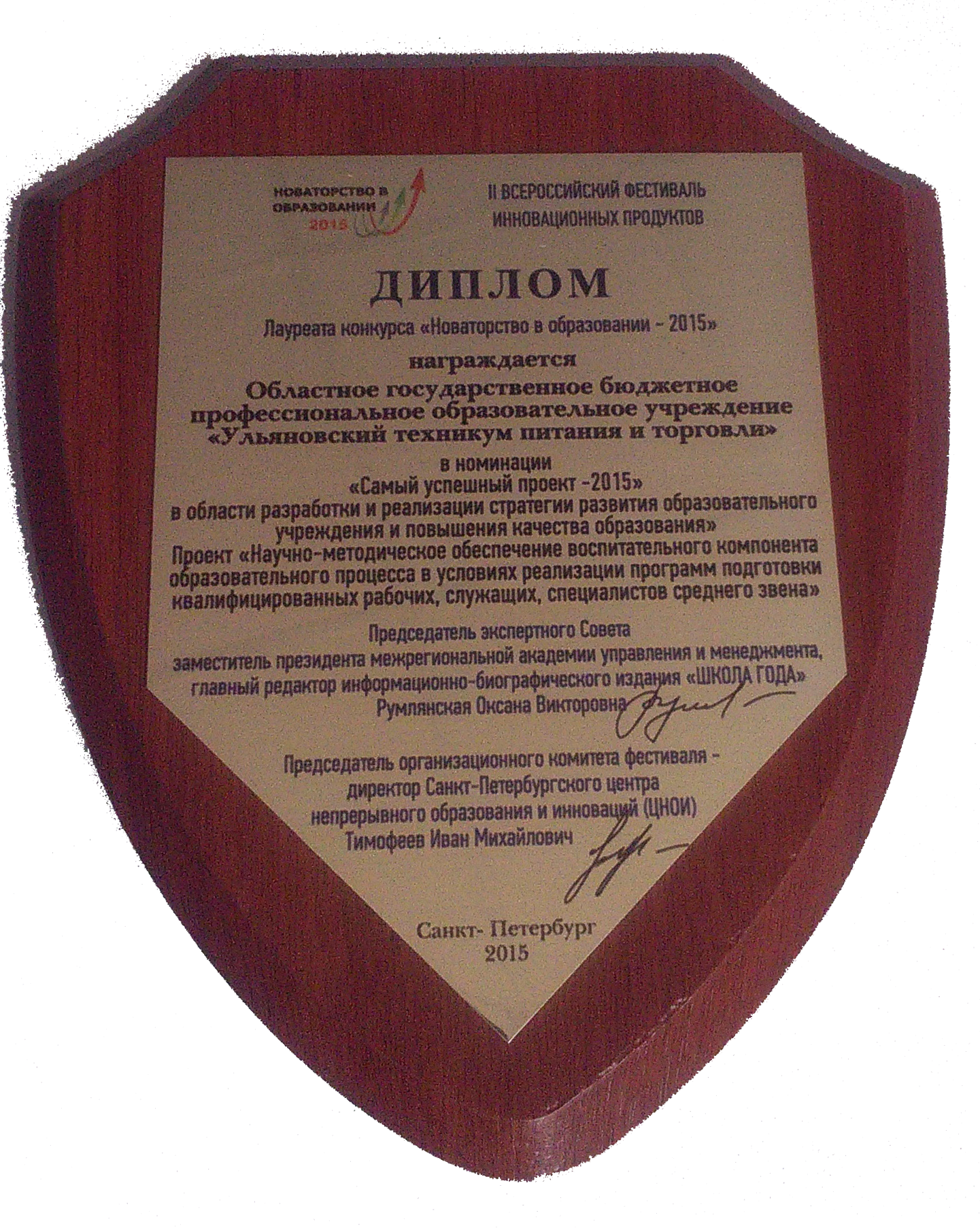 Диплом лауреата конкурса "Новаторство в образовании - 2015" в номинации "Самый успешный проект - 2015" в области разработки и реализации стратегии развития образовательного учреждения и повышения качества образования".