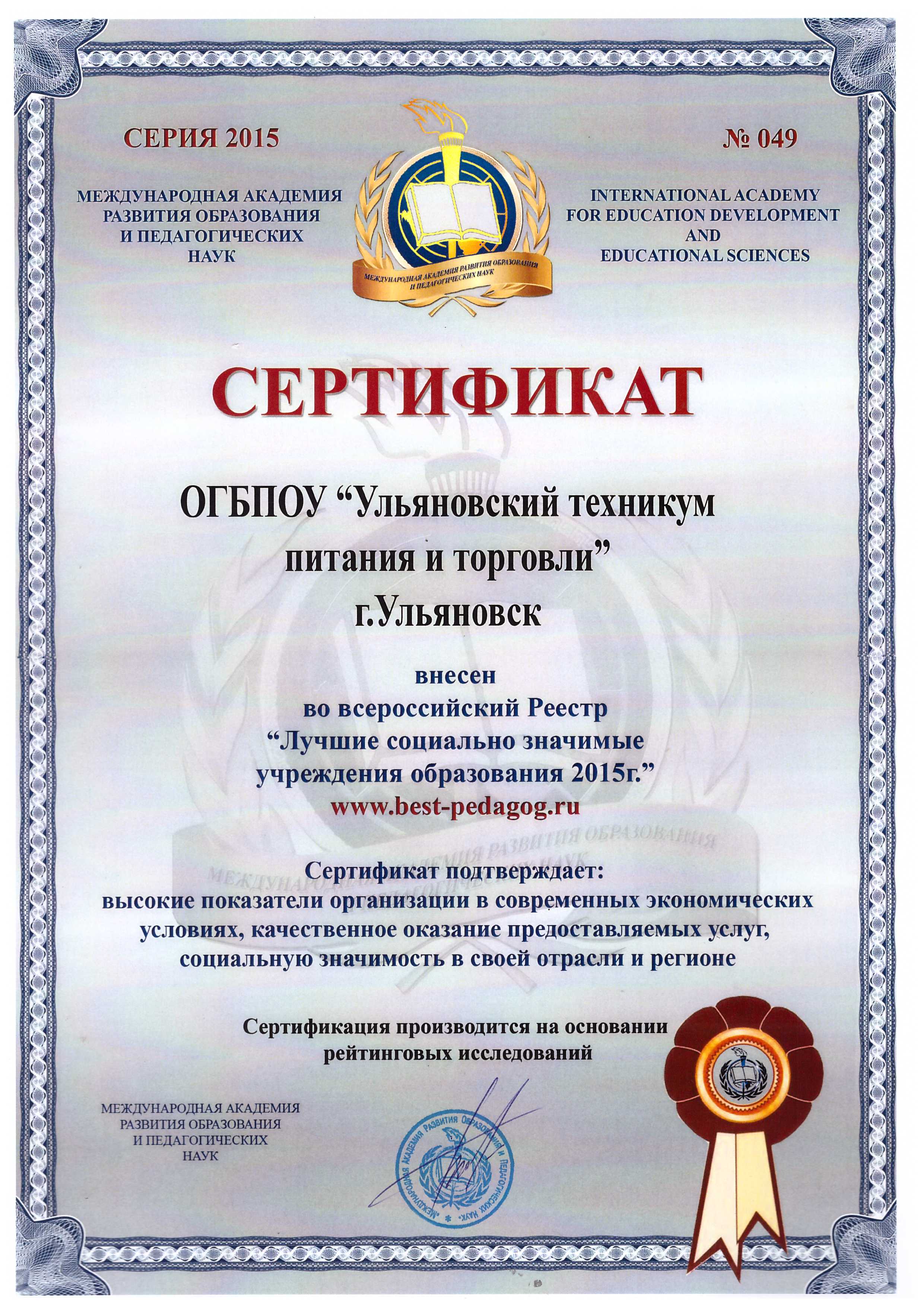 Сертификат ОГБПОУ "Ульяновский техникум питания и торговли" о внесении во всероссийский Реестр "Лучшие социально-значимые учреждения образования 2015г."